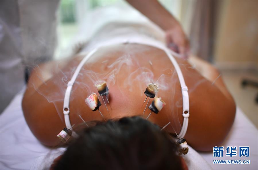 俄羅斯游客維多利亞·米哈拉普在三亞國際友好中醫(yī)療養(yǎng)院進(jìn)行中醫(yī)理療(2018年6月2日攝)。新華社記者郭程攝