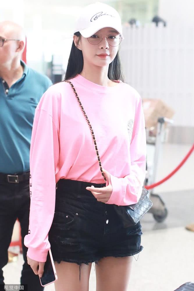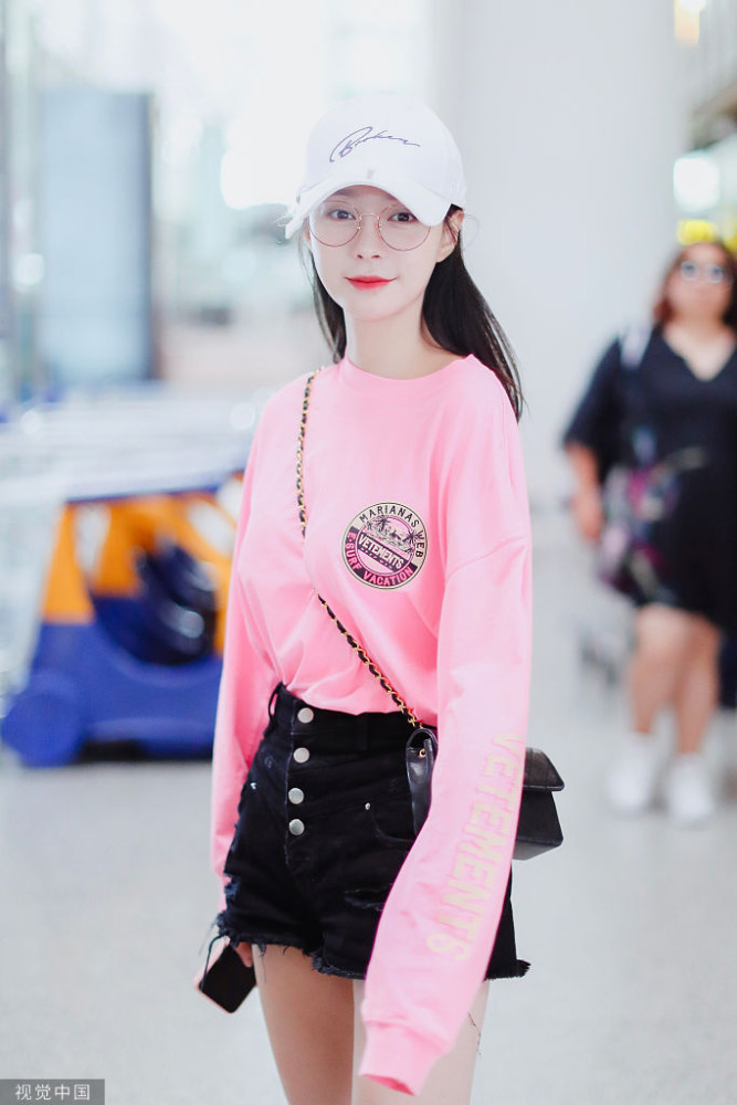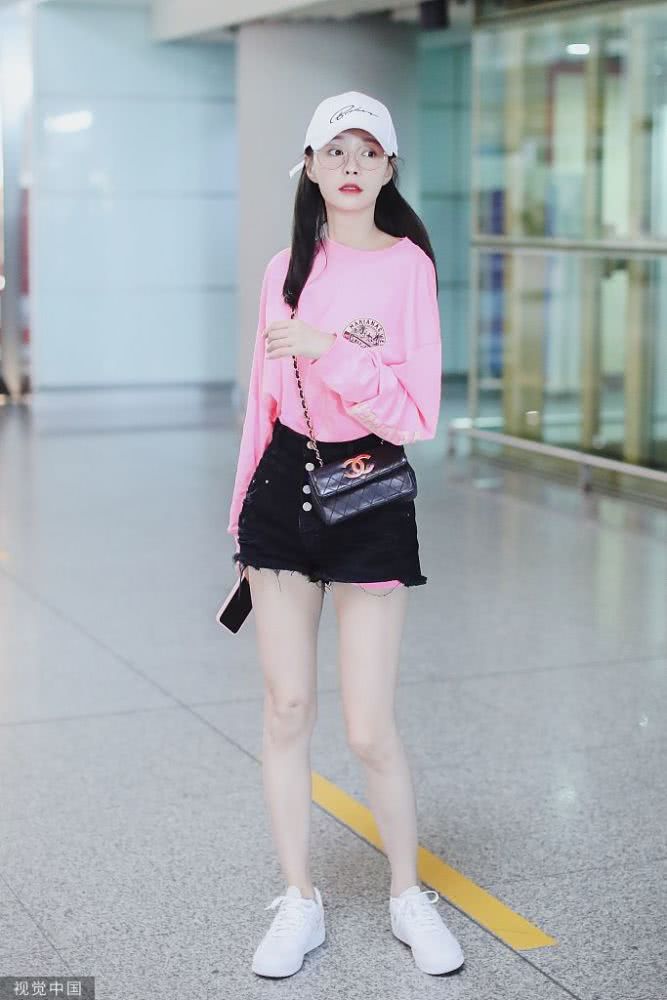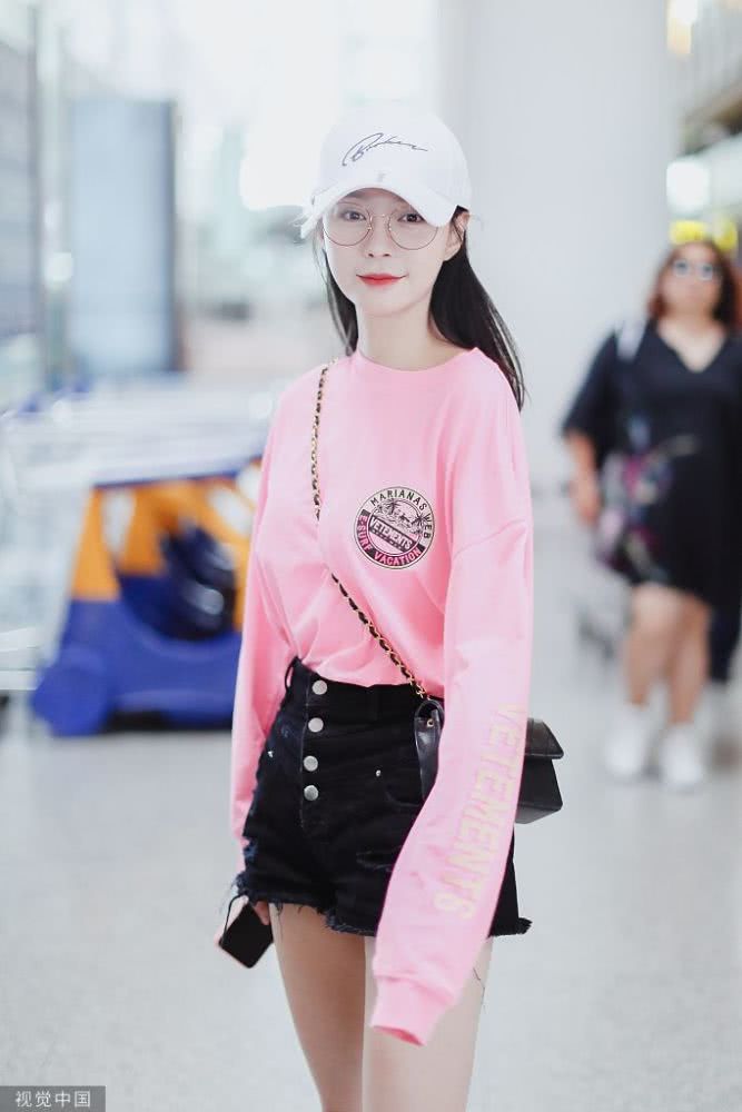 她戴著棒球帽身穿粉色衛(wèi)衣搭配熱褲,長腿纖細(xì)又白嫩。