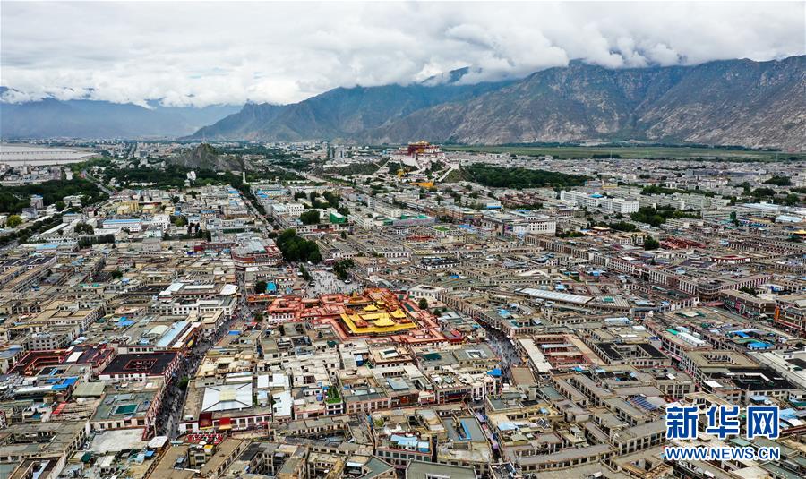 8月10日無人機(jī)拍攝的大昭寺和布達(dá)拉宮。新華社記者 王建華 攝