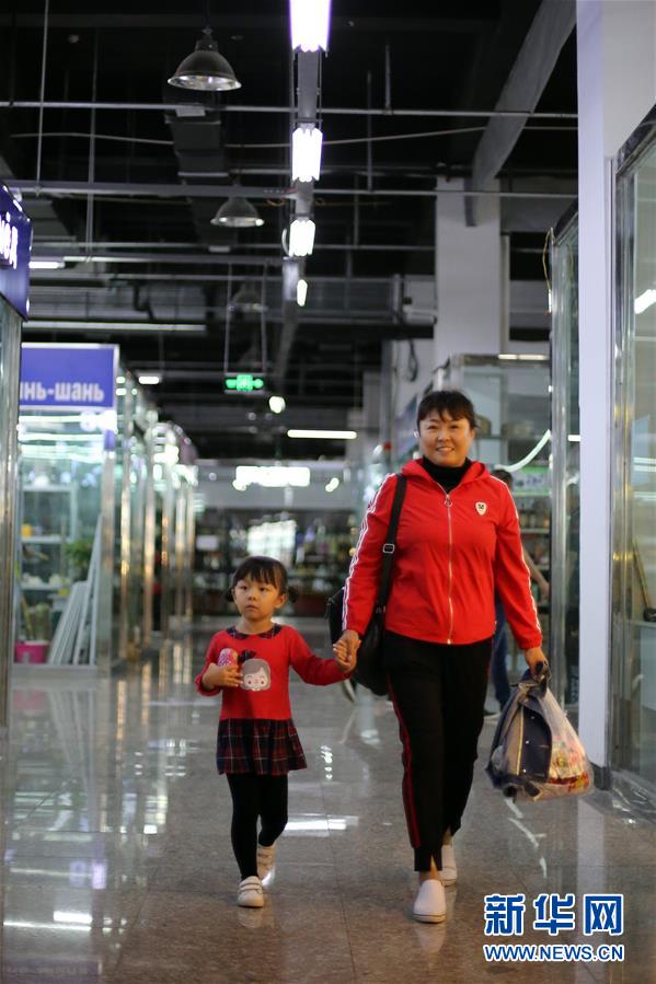 9月4日,在新疆塔城地區(qū)巴克圖口岸,塔城居民黃金瑞帶著女兒在絲路文化商品城內采購。 新華社記者程麗攝