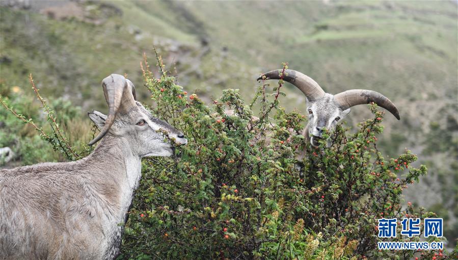 兩只巖羊在西藏山南市洛扎縣色鄉(xiāng)海拔4000米左右的盤山路邊,悠閑地吃著野果青草(9月22日攝)。 在西藏山南市洛扎縣色鄉(xiāng)海拔4000米左右的盤山路上,一群巖羊悠閑地吃著野果青草,完全不介意來往的車輛、行人和近在咫尺的鏡頭。 巖羊是國家二級(jí)保護(hù)動(dòng)物。近年來,隨著西藏生態(tài)保護(hù)力度加大,巖羊數(shù)量不斷增加。 新華社記者 晉美多吉 攝