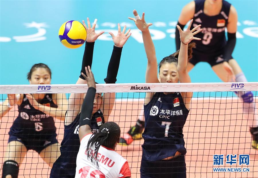 9月24日,中國隊球員姚笛(左二)和王媛媛(右)在比賽中攔網(wǎng)。當日,在日本札幌舉行的2019年女排世界杯賽第二階段A組循環(huán)賽中,中國隊以3比0戰(zhàn)勝肯尼亞隊。新華社記者杜瀟逸攝