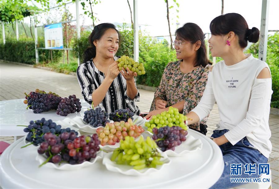 王衛(wèi)花(左一)在葡萄園內(nèi)向客戶介紹不同的葡萄品種(8月21日攝)。 新華社記者 邵瑞 攝
