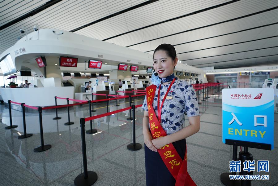 9月25日,中國聯(lián)合航空公司的工作人員在北京大興國際機(jī)場航站樓內(nèi)迎接乘客。新華社記者鞠煥宗攝