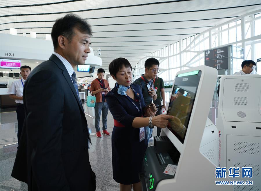 9月25日,中國東方航空公司工作人員(前左二)在指導(dǎo)乘客通過“人臉識別”辦理值機(jī)手續(xù)。新華社記者鞠煥宗攝
