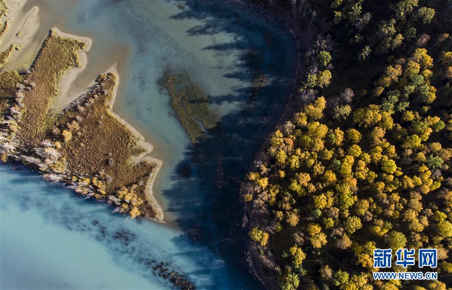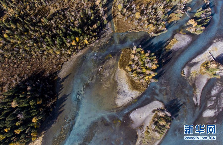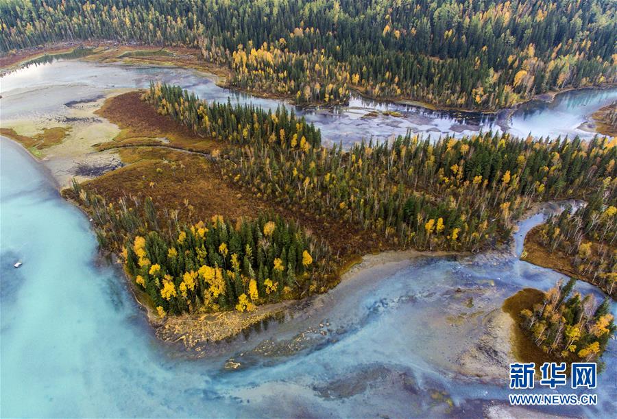 9月24日無人機拍攝的喀納斯景區(qū)風(fēng)光。新華社記者 王菲 攝