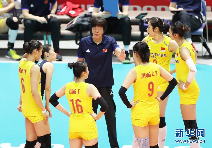 9月22日,中國隊主教練郎平(中)在比賽間隙指導球員。當日,在日本札幌舉行的2019年女排世界杯賽第二階段A組循環(huán)賽比賽中,中國隊以3比2戰(zhàn)勝巴西隊。新華社記者杜瀟逸攝