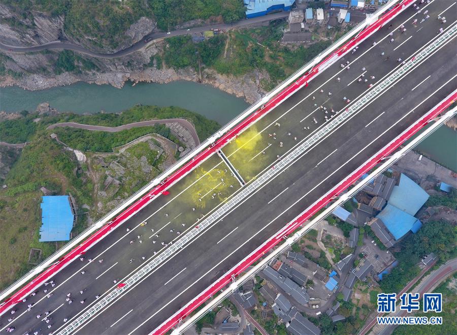 9月30日,赤水河大橋建設(shè)者以一場(chǎng)彩虹跑慶祝大橋建成(無人機(jī)攝)。新華社記者劉坤攝