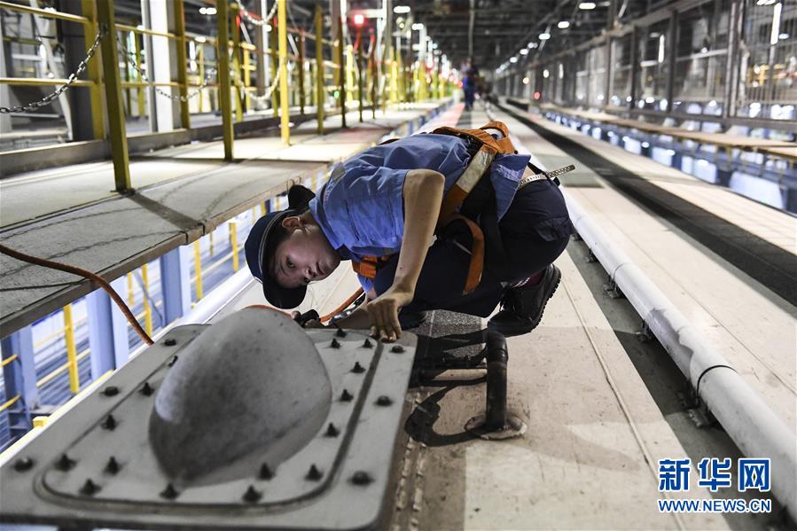 “動車醫(yī)生”在對車頂?shù)腇M天線進行檢查(10月2日攝)。 新華社記者 曹祎銘 攝