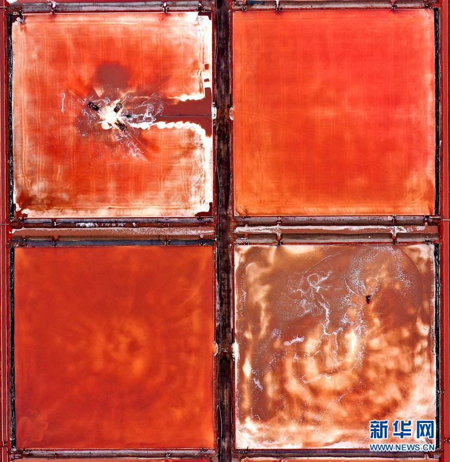 日前,山東省無棣縣境內的魯北鹽場進入海鹽收獲季節(jié),星羅棋布的鹽池將大地裝扮得繽紛如畫。無棣縣位于山東省北部渤海之濱,全縣擁有鹽田365萬公畝,是我國重要的海鹽生產基地。據(jù)無棣縣工信局統(tǒng)計,今年1-9月份,當?shù)卦}產量111.7萬噸。