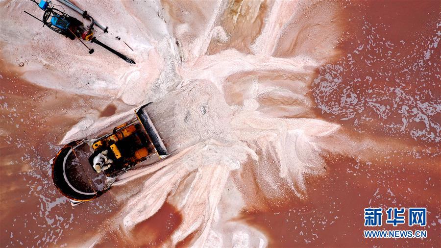 魯北鹽場工人在鹽池中收獲海鹽(10月9日無人機拍攝)。新華社記者 朱崢 攝