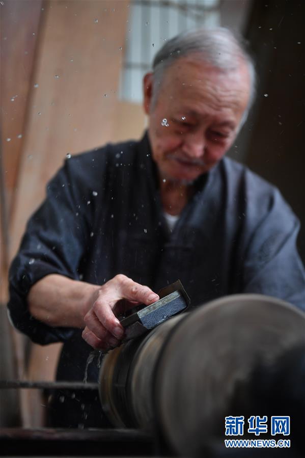 10月12日,丁國坤在家中對一件未成形的脫胎漆器進行“水磨”工序。新華社記者胡晨歡攝