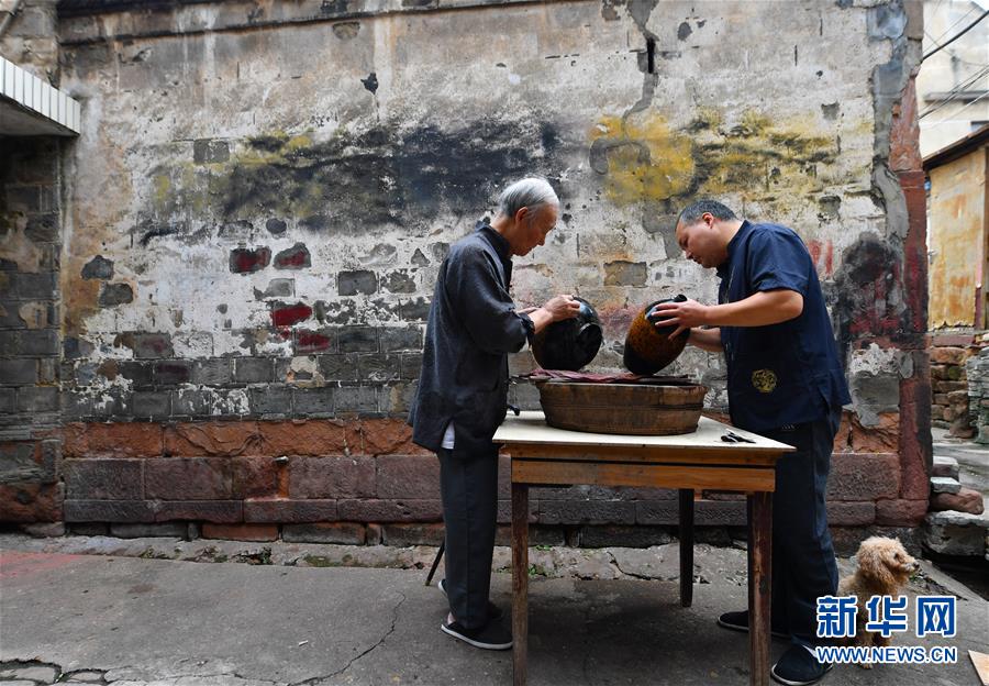 10月12日,丁國(guó)坤(左)和徒弟在家門(mén)口對(duì)未成形的脫胎漆器進(jìn)行“磨顯”工序。新華社記者胡晨歡攝