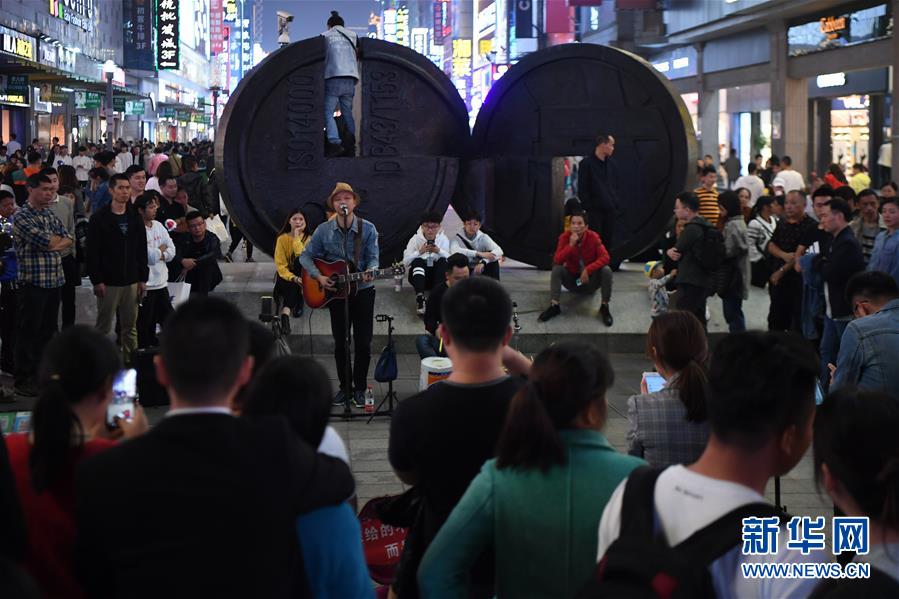 10月12日,長沙黃興路步行街持證上崗的街頭藝人在表演時(shí)吸引路人圍觀。新華社記者薛宇舸攝