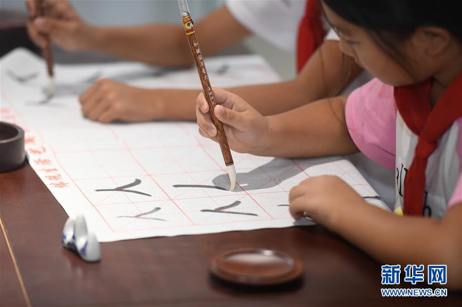 10月14日,小學(xué)生在非遺活態(tài)傳承館使用湖筆練習(xí)書(shū)法。 新華社記者 黃宗治 攝