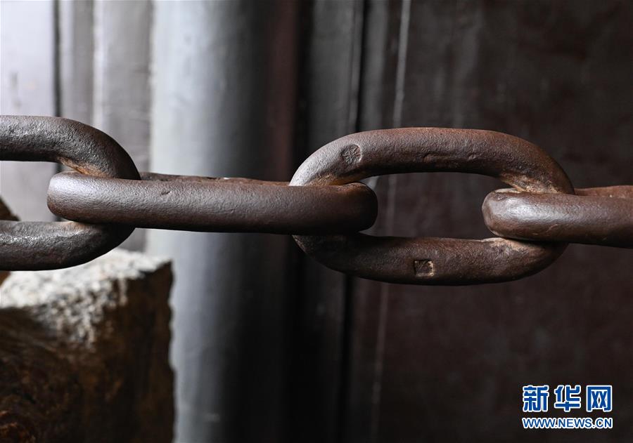 瀘定橋的鎖鏈總共有12164個(gè)鐵環(huán)相扣,現(xiàn)今仍可在鐵環(huán)上看到一些獨(dú)特的標(biāo)記(6月27日攝)。 新華社記者 江宏景 攝