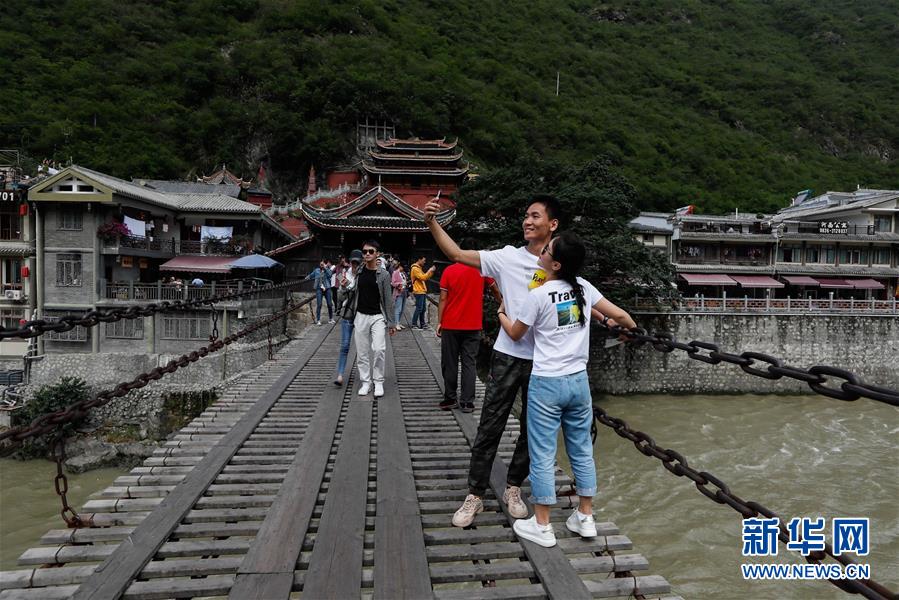 一對(duì)情侶在瀘定橋上留影(6月27日攝)。 新華社記者 江宏景 攝