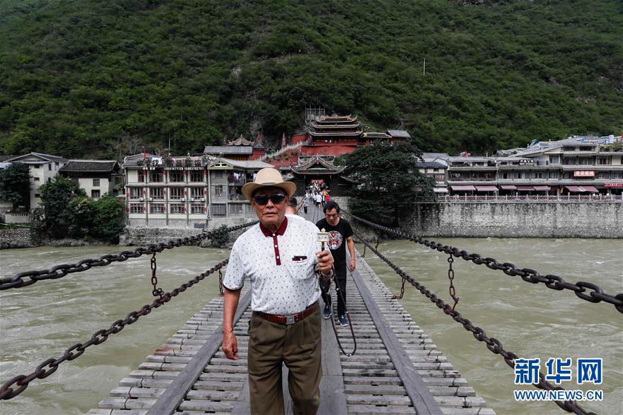 一位當(dāng)?shù)夭刈謇先私?jīng)過瀘定橋(6月27日攝)。 新華社記者 江宏景 攝