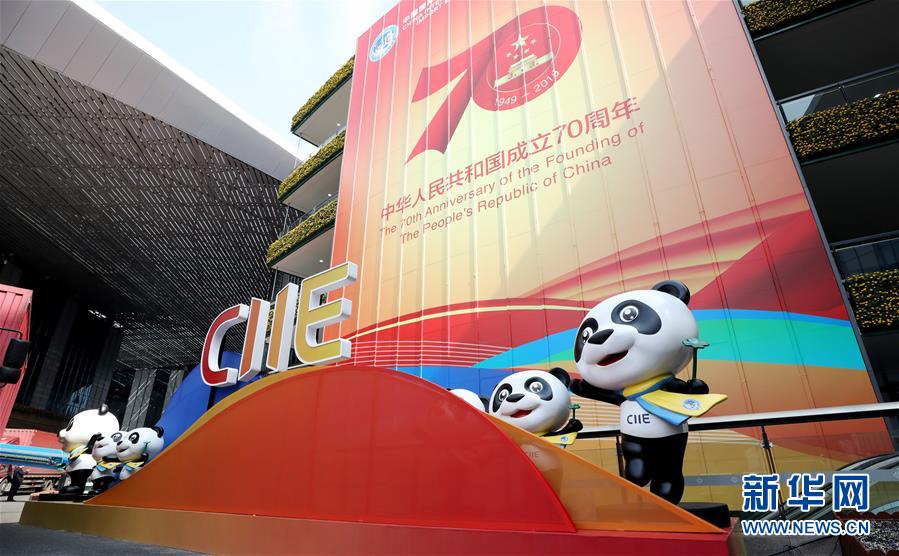 10月25日,國(guó)家會(huì)展中心(上海)內(nèi)慶祝國(guó)慶的裝飾前擺放了進(jìn)博會(huì)標(biāo)識(shí)和吉祥物熊貓進(jìn)寶。 新華社記者 方喆攝
