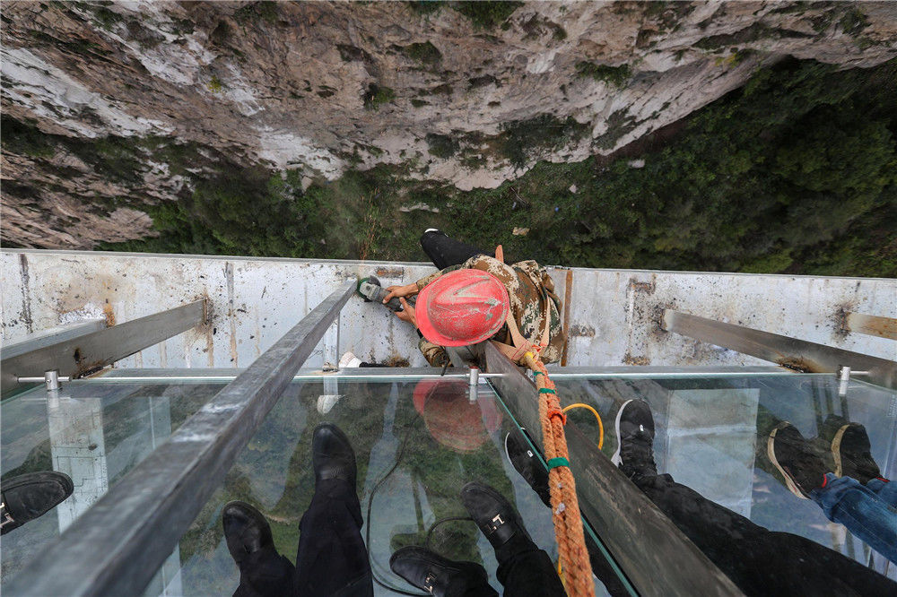 2019年9月20日,從落差198米懸崖上伸出周長60米懸空的“高空玻璃懸廊”在河南南陽七峰山落成,該玻璃懸廊名為“云頂之心”。圖為建筑工人進(jìn)行收尾工作。王中舉(河南分社)/中新社/視覺中國編輯/康娜