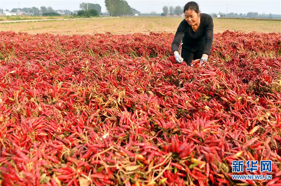 河南省寶豐縣鬧店鎮(zhèn)周營(yíng)村的村民在晾曬辣椒(10月16日攝)。