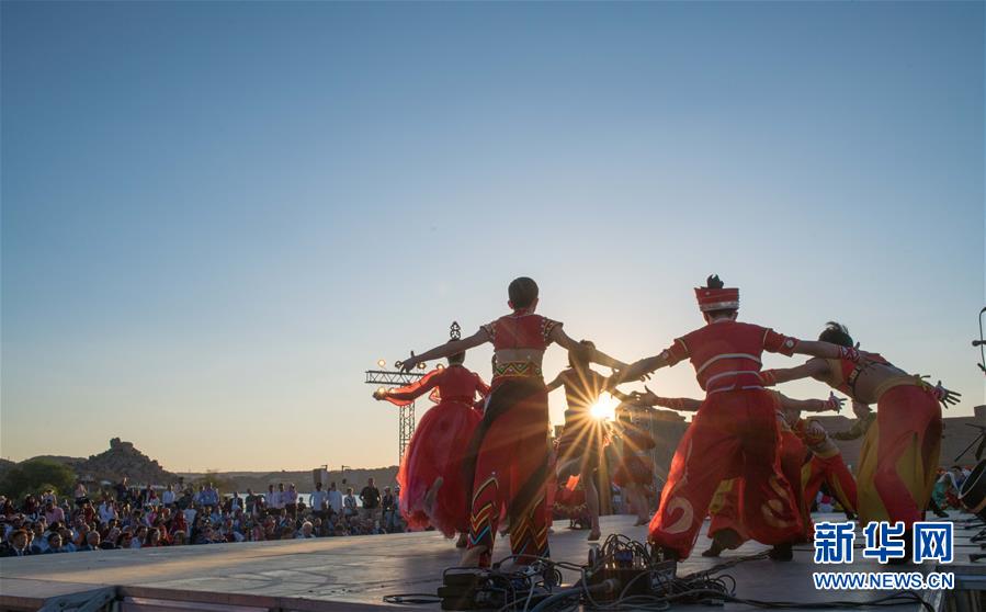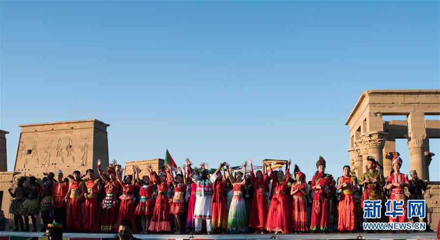 10月27日,來自福建省廈門市的小白鷺民間舞團的演員在位于埃及阿斯旺的菲萊神廟表演。 新華社記者 鄔惠我 攝