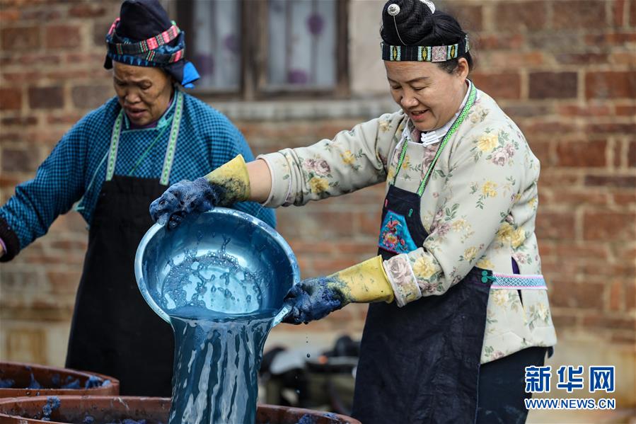 10月28日,楊芳(右)在家中制作靛藍(lán)染料。新華社記者 歐東衢 攝