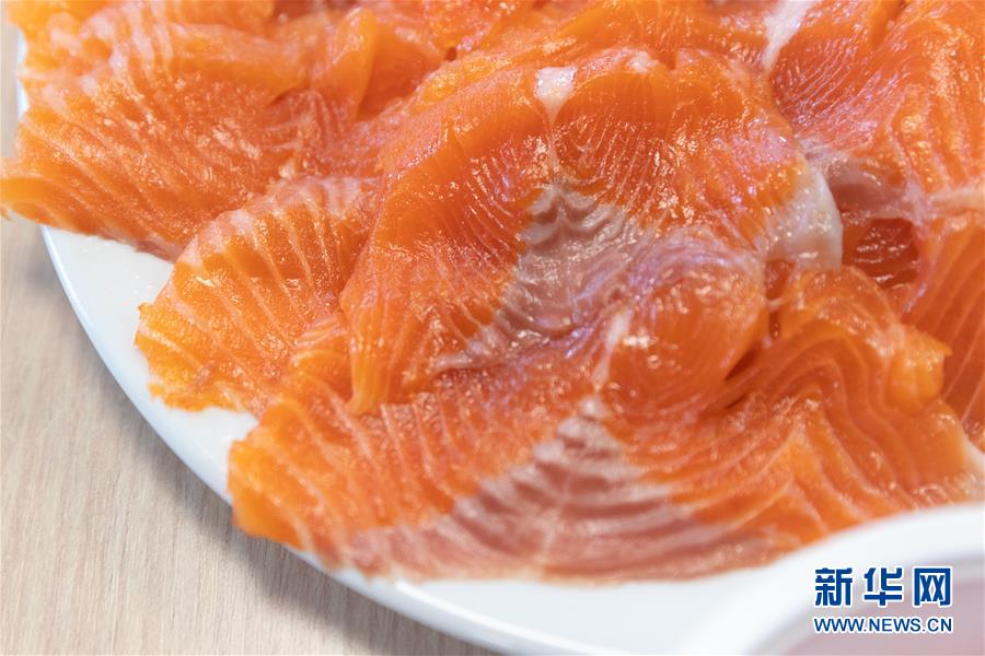 這是9月13日在俄羅斯摩爾曼斯克以北的巴倫支海域的鮭魚養(yǎng)殖場拍攝的鮭魚肉片。 新華社記者白雪騏攝