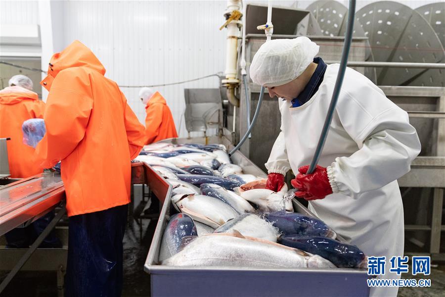 9月13日,在俄羅斯摩爾曼斯克,俄羅斯水產(chǎn)養(yǎng)殖公司工作人員清洗鮭魚。 新華社記者白雪騏攝