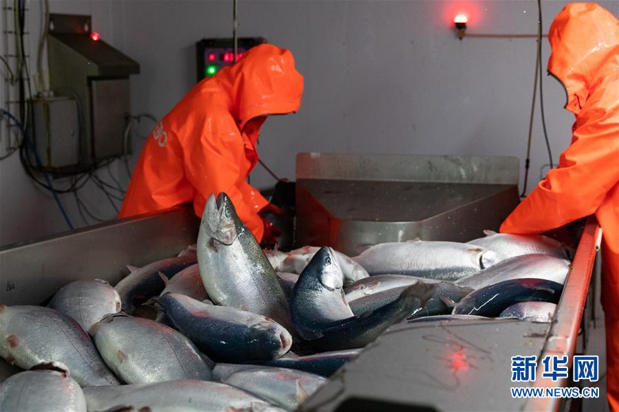 9月13日,在俄羅斯摩爾曼斯克,俄羅斯水產養(yǎng)殖公司工作人員在車間處理鮭魚。 新華社記者白雪騏攝