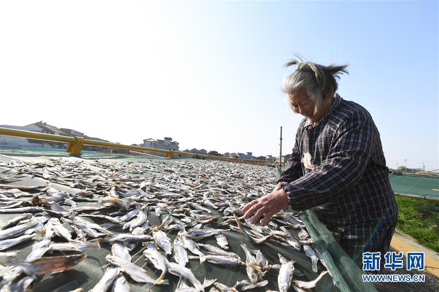 3月12日,浙江省湖州市吳興高新區(qū)幻溇村村民在翻動(dòng)晾曬的魚干。近日,太湖南岸湖州地區(qū)久雨初晴,漁民忙著制作、晾曬魚干。新華社記者翁忻旸攝