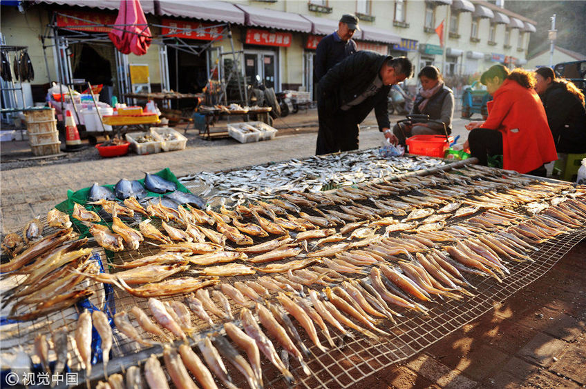 2018年11月19日,山東青島積米崖漁港,漁民晾曬的魚干。