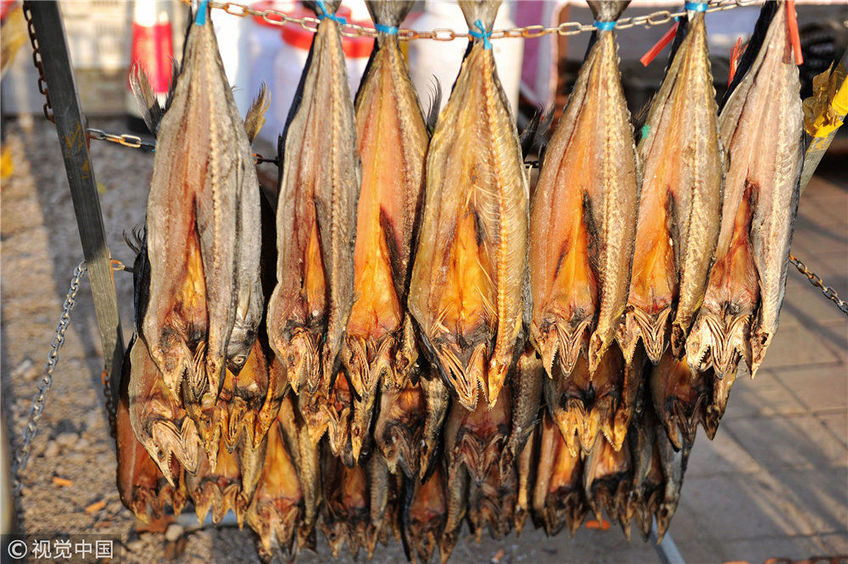 2018年11月19日,山東青島積米崖漁港,海鮮市場出售的真空包裝魚干。
