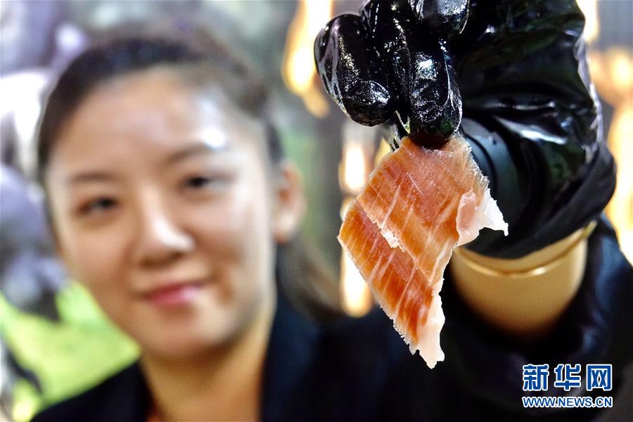 11月5日,在第二屆進(jìn)博會(huì)食品及農(nóng)產(chǎn)品展區(qū),工作人員展示西班牙橡果火腿。新華社記者才揚(yáng)攝