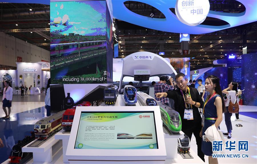 11月2日,在第二屆中國國際進口博覽會國家展展區(qū)內的中國館,工作人員在一組中國鐵路展品旁討論交流。新華社記者方喆攝