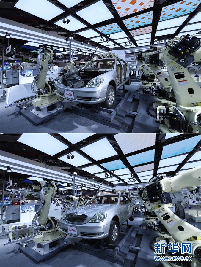 11月5日在第二屆進(jìn)博會(huì)裝備展區(qū)日本那智不二越公司展臺(tái)拍攝的拼版照片。上圖是NACHI超高速點(diǎn)焊SRA系列機(jī)器人操作前的汽車骨架;下圖為間隔一分鐘后拍攝的NACHI超高速點(diǎn)焊SRA系列機(jī)器人操作后的汽車外殼。新華社記者范培珅攝