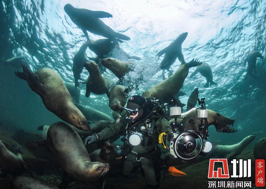 32歲的 Maxwel Hohn是一名水下攝影師,日前,他潛入加拿大溫哥華海域,沒想到撞見海獅“大軍”,這50來只家伙對(duì)于 Maxwel的出現(xiàn)興奮不已,立刻將他團(tuán)團(tuán)圍住,仿佛進(jìn)了盤絲洞。