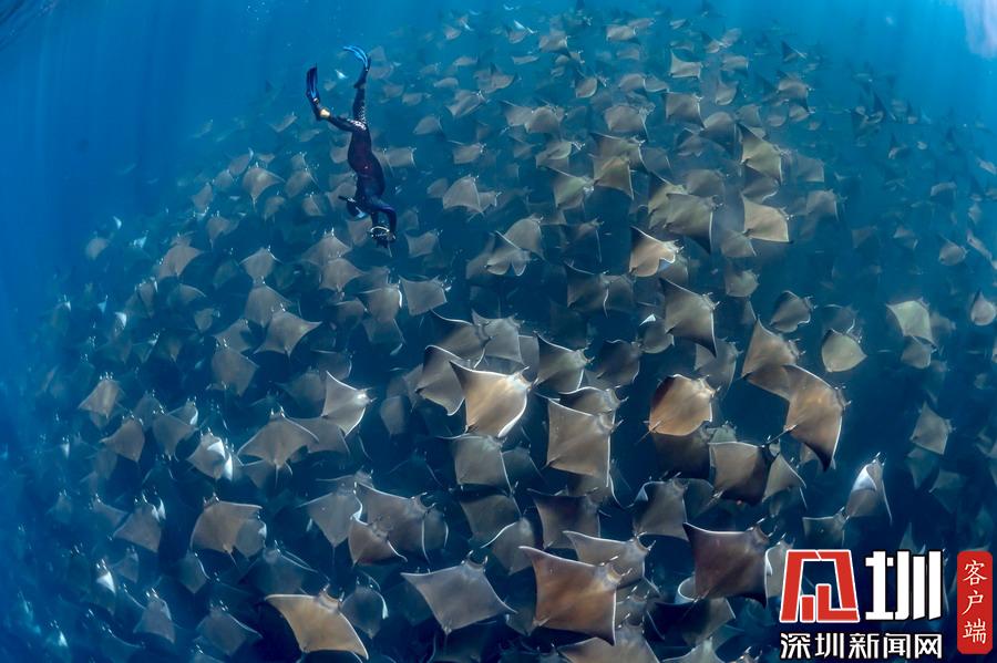 2019年5月31日?qǐng)?bào)道(圖片拍攝于4月23日),環(huán)?;顒?dòng)家兼潛水教練Jay Clue上個(gè)月在墨西哥下加利福尼亞州洛斯卡沃斯附近海岸,幸運(yùn)地邂逅了一支蝠鲼遷徙大軍,數(shù)百只蝠鲼浩浩蕩蕩在海水中行進(jìn),畫面十分震撼。