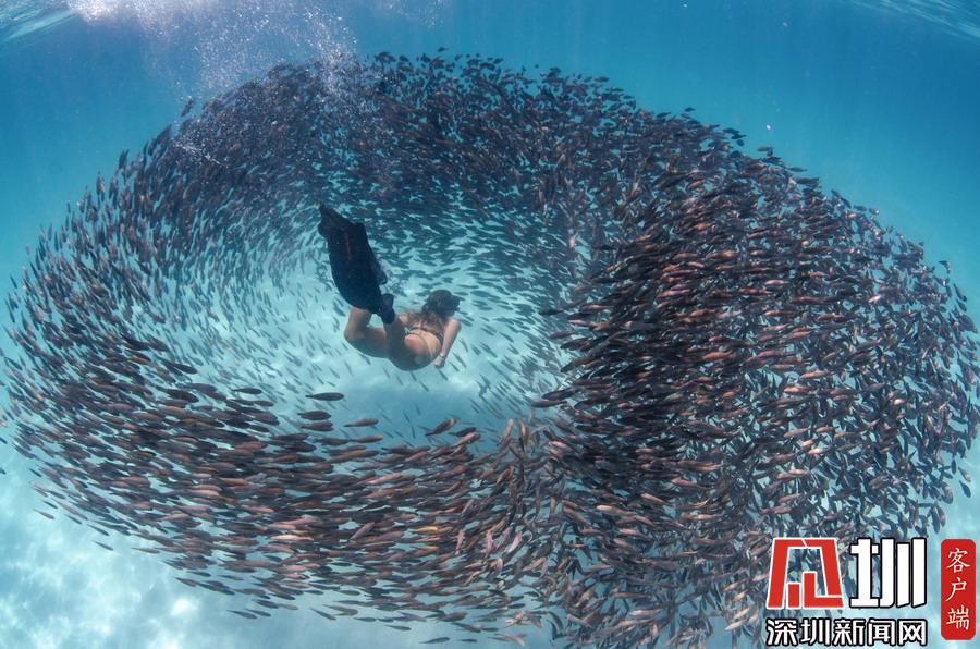 2018年12月24日?qǐng)?bào)道(具體拍攝時(shí)間不詳),這張?bào)@艷的照片記錄了沙丁魚大軍為一位幸運(yùn)的潛水員讓路的瞬間,數(shù)百萬條銀光閃閃的小魚兒簇?fù)韲@在他的一側(cè),恰似熠熠生輝的繁星,如眾星捧月一般畫面十分驚艷。