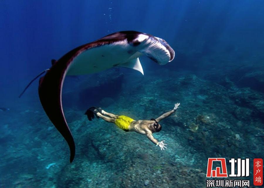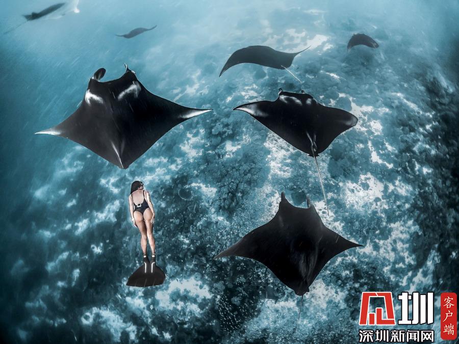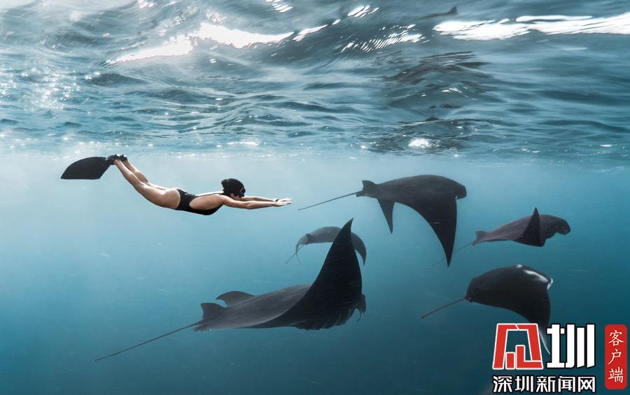 2019年7月2日?qǐng)?bào)道(具體拍攝時(shí)間不詳),印度尼西亞科莫多國(guó)家公園,美國(guó)自由潛水愛好者Kristina Zvaritch一次潛水時(shí),她的正下方恰巧游著幾只巨大的蝠鲼,這令人驚艷的一幕恰巧被她的丈夫拍下來了。當(dāng)她看到這些照片時(shí),自己都被驚呆了。晶瑩剔透的海水使這張照片有了視覺錯(cuò)位的效果,讓人以為Kristina與這些魚處于相同的高度,但實(shí)際上她離這些魚還有10-19英尺左右的距離。
