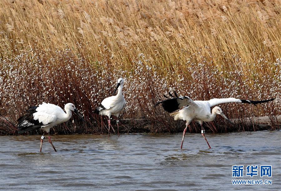 這是在樂(lè)亭縣野生動(dòng)物保護(hù)協(xié)會(huì)大清河鳥類救助站放飛回歸大自然的三只國(guó)家一級(jí)保護(hù)動(dòng)物東方白鸛(11月16日攝)。新華社記者楊世堯攝