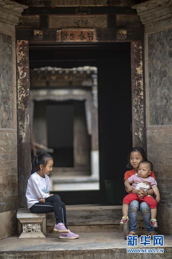 石屏縣異龍鎮(zhèn)符家營村的小朋友鄭淇(左)與小伙伴在村里的老屋門前休息(8月8日攝)。新華社記者江文耀攝