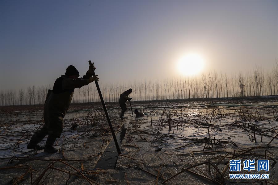 11月18日,工人在采收蓮藕。初冬時(shí)節(jié),河北省唐山市曹妃甸蓮藕豐收,工人們?cè)诮Y(jié)冰之前忙著采收蓮藕。新華社記者邢廣利攝