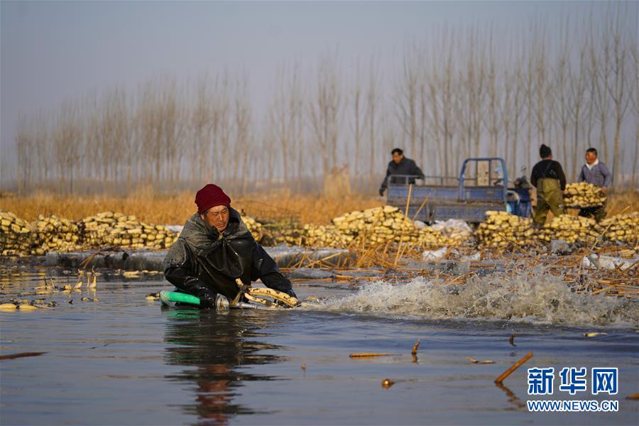 11月18日,工人在采收蓮藕。初冬時(shí)節(jié),河北省唐山市曹妃甸蓮藕豐收,工人們?cè)诮Y(jié)冰之前忙著采收蓮藕。新華社記者楊世堯攝
