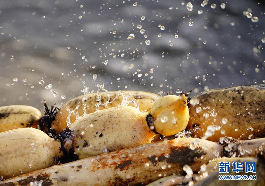 11月18日拍攝的蓮藕。初冬時節(jié),河北省唐山市曹妃甸蓮藕豐收,工人們在結(jié)冰之前忙著采收蓮藕。新華社記者邢廣利攝