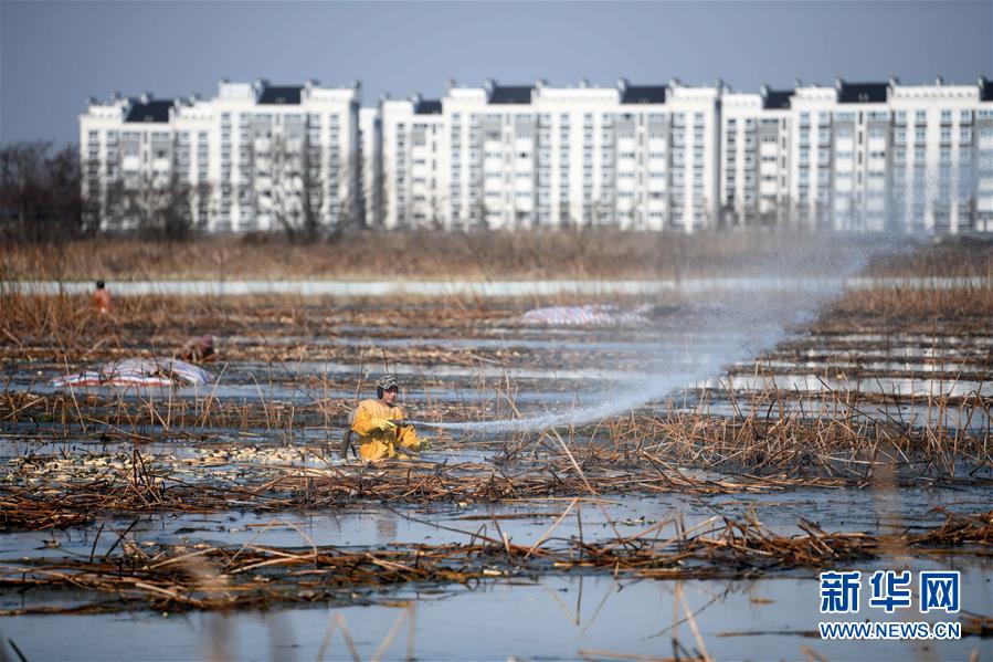 來自淮南的挖藕人張作志在肥西縣豐樂鎮(zhèn)一蓮藕種植基地用高壓水槍沖掉冰層。新華社記者劉軍喜攝