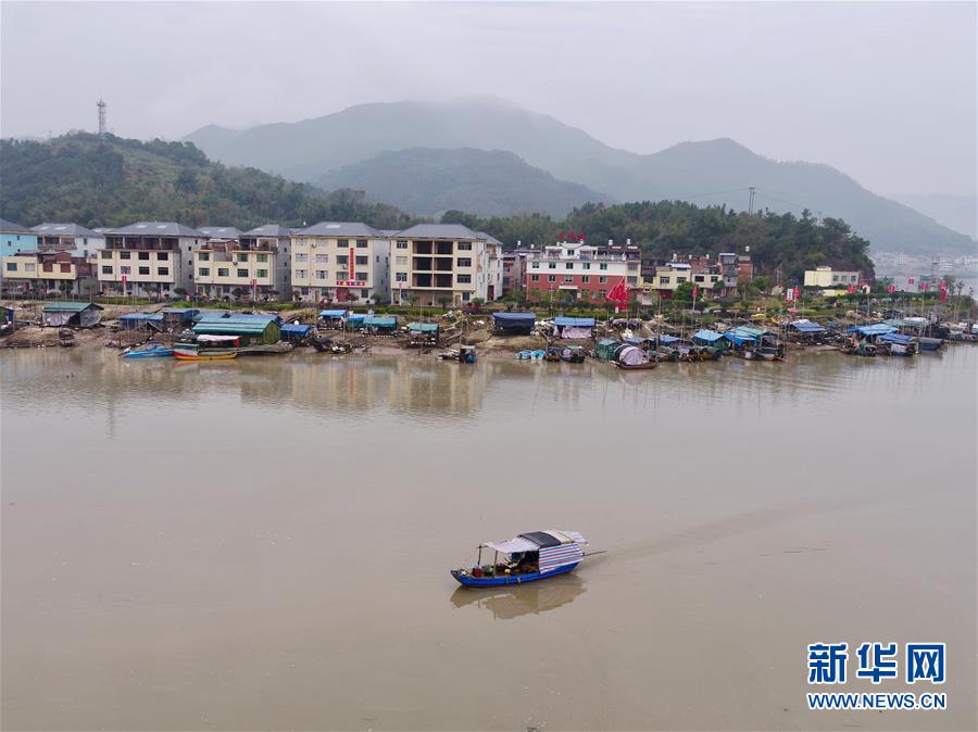 在寧德福安市溪邳村,一艘漁船經(jīng)過岸上新居(3月8日無人機拍攝)。新華社記者姜克紅攝
