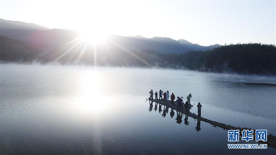 11月14日,游客在奇墅湖邊拍照(無人機(jī)拍攝)。新華社記者張端攝