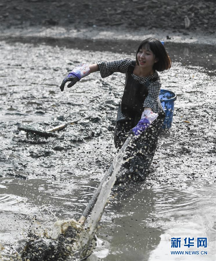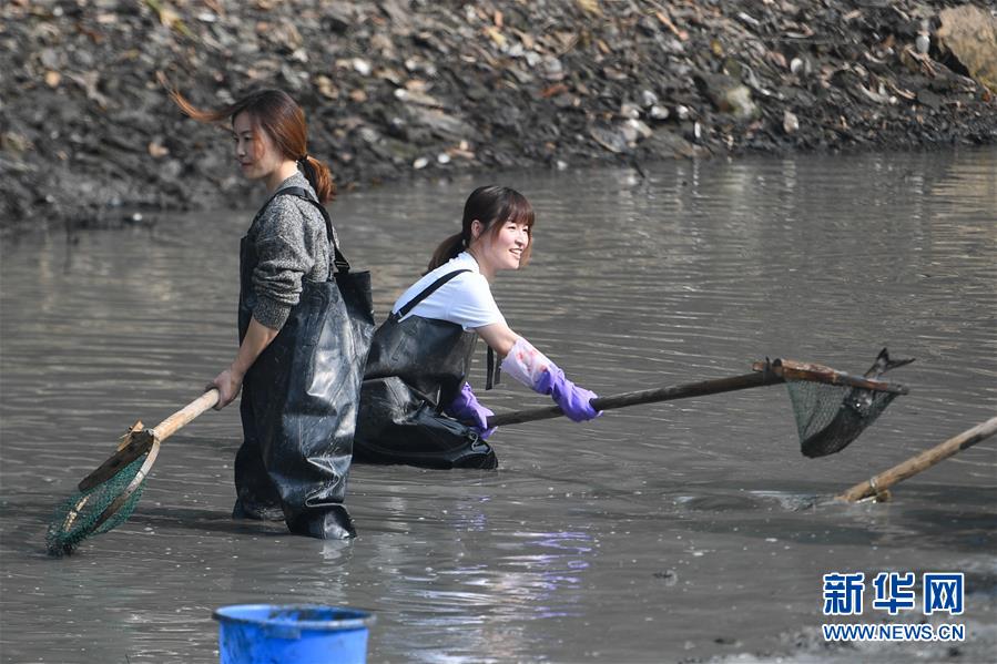 11月24日,游客在西溪濕地體驗(yàn)“干塘”捕魚(yú)。近日在杭州西溪國(guó)家濕地公園,漁夫們抽掉塘水清理淤泥,一批游客借用漁夫們的下水褲,體驗(yàn)“干塘”捕魚(yú)?!案商痢笔呛贾菸飨粠Т迕竦膫鹘y(tǒng)生產(chǎn)習(xí)俗,漁戶(hù)在冬季將魚(yú)塘內(nèi)的水抽掉,清挖淤泥,以便第二年可以更好地養(yǎng)魚(yú)。新華社記者黃宗治攝