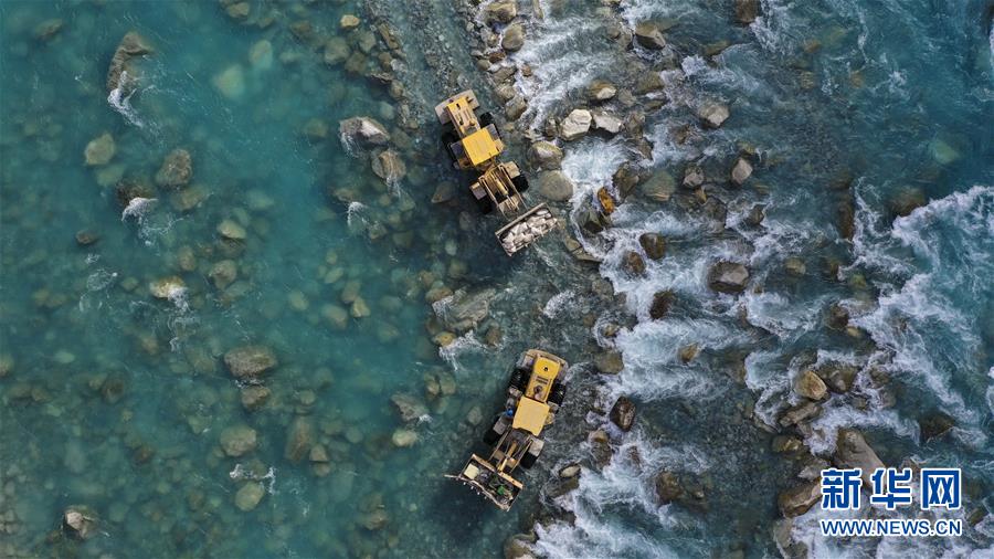 在新疆塔什庫爾干塔吉克自治縣大同鄉(xiāng)庫如克欄桿村,電力工人利用施工車輛運送水泥、鐵塔零件過河,為鋪設線路做準備(11月24日無人機拍攝)。
